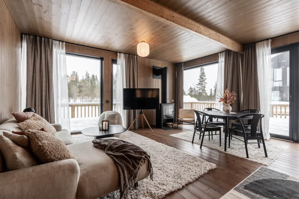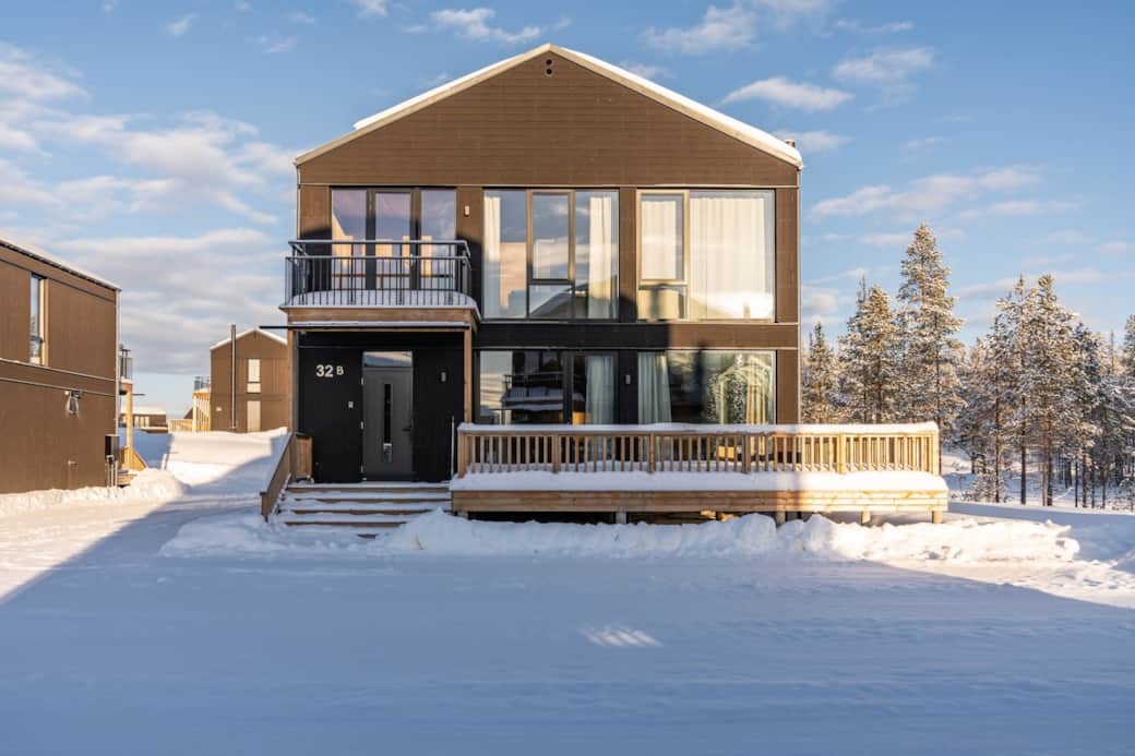 Den rymliga lägenheten på 93 kvm rymmer 8 gäster med en kingsizesäng, en queensizesäng och två våningssängar. Här finns fullt utrustat kök, kamin, bastu, två toaletter och en veranda med fantastisk utsikt.